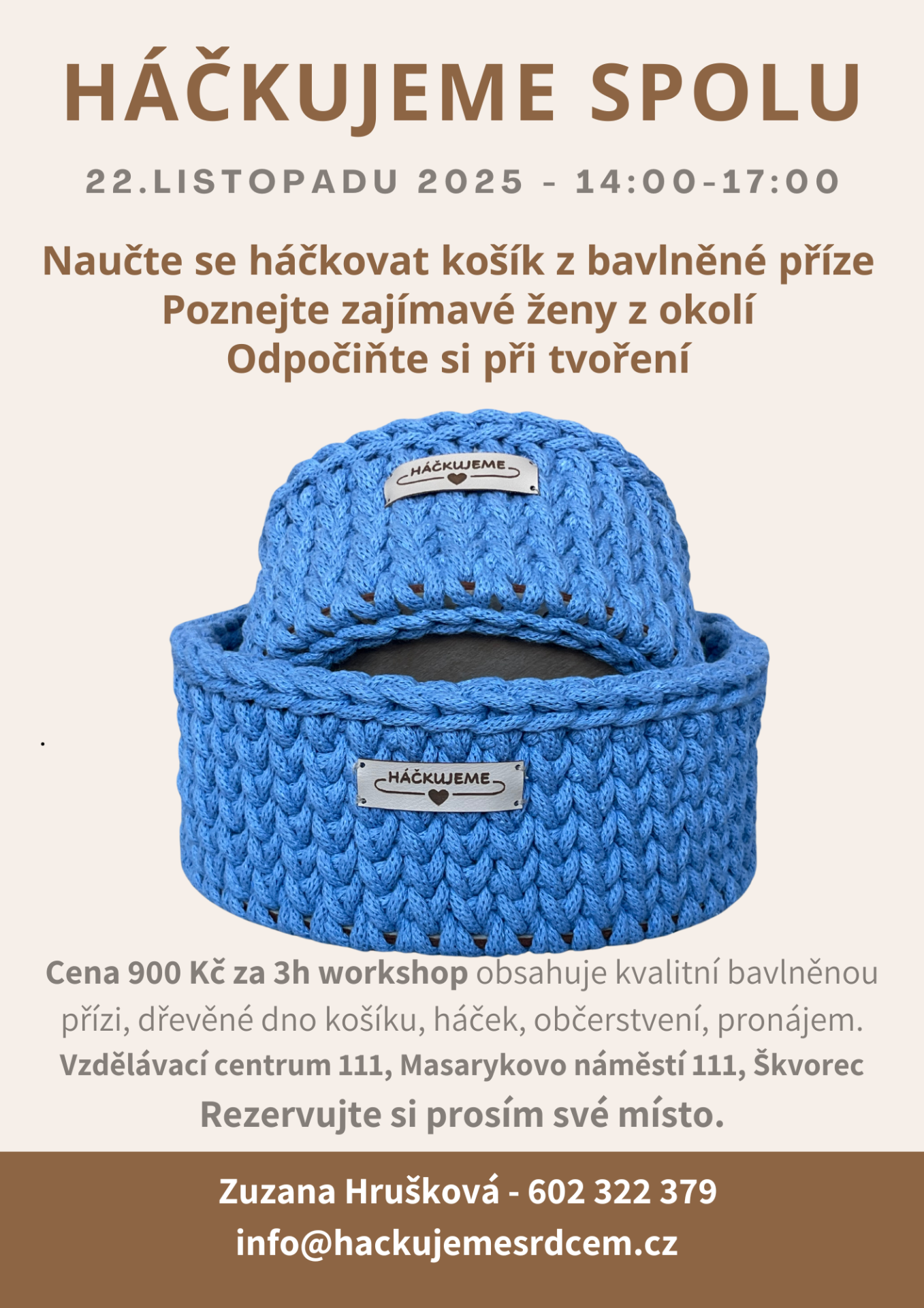 V uvedené ceně workshopu je příze (na výběr v různých barvách), dřevěné dno košíku, háček, občerstvení a pronájem místa.